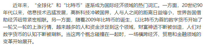近年來,“全球化”和“比特幣”逐漸成為國際經(jīng)濟領(lǐng)域的熱門詞匯。一方面,20世紀90年代以來,信息技術(shù)迅猛發(fā)展,高新科技沖破國界,......