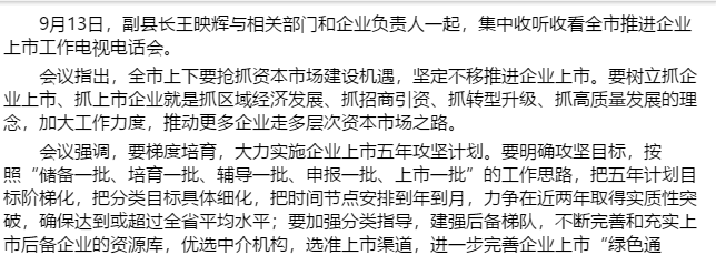 9月13日,副縣長王映輝與相關部門和企業(yè)負責人一起,集中收聽收看全市推進企業(yè)上市工作電視電話會?! h指出,全市上下要搶抓資本......