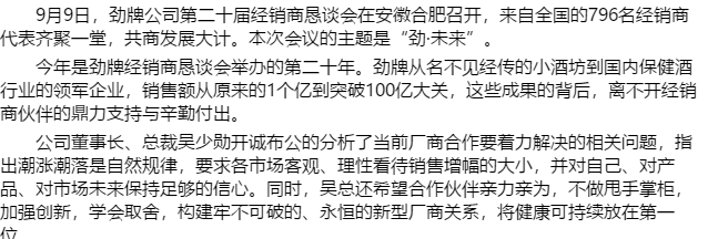 9月9日,勁牌公司第二十屆經(jīng)銷商懇談會在安徽合肥召開,來自全國的796名經(jīng)銷商代表齊聚一堂,共商發(fā)展大計。本次會議的主題是“勁·......
