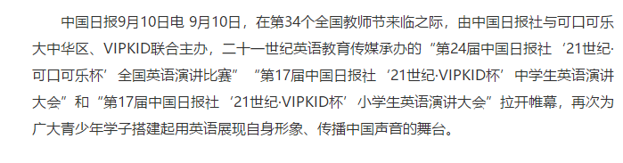 中國(guó)日?qǐng)?bào)9月10日電 9月10日,在第34個(gè)全國(guó)教師節(jié)來(lái)臨之際,由中國(guó)日?qǐng)?bào)社與可口可樂(lè)大中華區(qū)、VIPKID聯(lián)合主辦,二十一世紀(jì)......