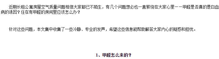 近期長(zhǎng)租公寓房屋空氣質(zhì)量問(wèn)題相信大家都已不陌生,有幾個(gè)問(wèn)題想必也一直縈繞在大家心里——甲醛是否真的是白血病的誘因?住在有甲醛的房......