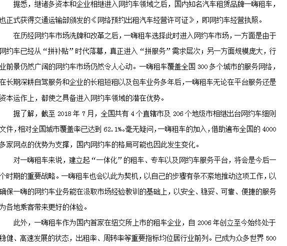 據(jù)悉,繼諸多資本和企業(yè)相繼進入網(wǎng)約車領(lǐng)域之后,國內(nèi)知名汽車租賃品牌一嗨租車,也正式獲得交通運輸部頒發(fā)的《網(wǎng)絡(luò)預(yù)約出租汽車經(jīng)營許可......