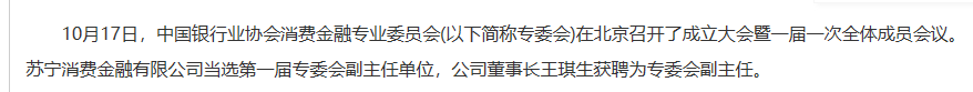 蘇寧消費金融當選中銀協(xié)消費金融專業(yè)委員會副主任單位
