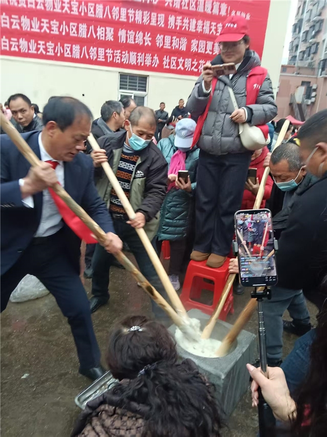 演出結(jié)束以后又開(kāi)展了福年豬,喝臘八粥,寫(xiě)春聯(lián),打糍粑,喝晃子湯,理發(fā),義診等民俗活動(dòng),通過(guò)這些活動(dòng)共敘鄰里之情,共品五谷陳香,共賞臘八民俗,讓人們記住了鄉(xiāng)愁,傳承了文明。整場(chǎng)活動(dòng)秩序井然,反響極佳。社區(qū)居民徐世倫深有感觸地說(shuō):“這是白云物業(yè)和社區(qū)居委會(huì)送給居民最好的節(jié)日盛宴,希望以后經(jīng)常開(kāi)展”。